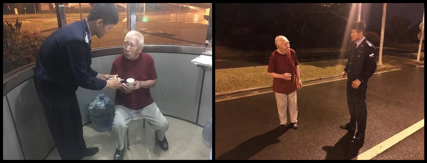 2018年10月10日凌晨3:40左右,紫竹城区管理公司安保队长徐流清、副队长孙俊在紫竹高新区内正常巡逻,在紫光路/紫星南路的路灯下,发现了一名行动不便的老人在路边缓缓向前挪动。